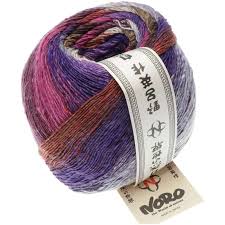 Beautiful Yukata by Noro, fine (#2) 4/5 ply - a huge 200g ball - 720 metres - 50% Silk, 25% Wool, 25% Polyester blend. 3.5 - 4 mm needle rec. Made in Japan.