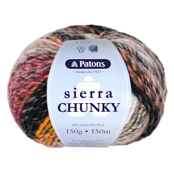 NEW Sierra Chunky - a fantastic chunky version of the ever popular Sierra. Big 150 gram balls with 150 metres per ball. Needle rec. 9 mm. Tension 15 rows to 10.5 sts. Machine washable. Perfect for throw rugs or garments. Free pattern for the Emotion throw available. Download at Australian Yarn company or ask for a copy with your order (mention in the comments box at checkout)