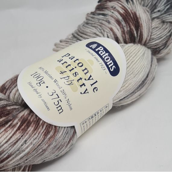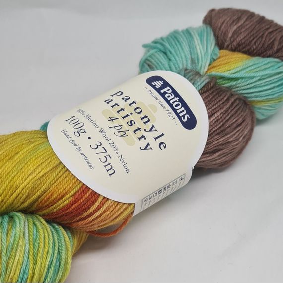 Patonyle Artistry is a hand dyed Patonyle 4 ply sock wool in 100 gr hanks. Patonyle is a classic yarn from Patons and now they have added this modern twist to the range. 4 ply wool merino wool with 20% nylon. 375 metres per 100 gram skein. Patonyle is used as a sock yarn but also as a lovely quality yarn for adults or childrens knitting and for scarves, hats and wraps