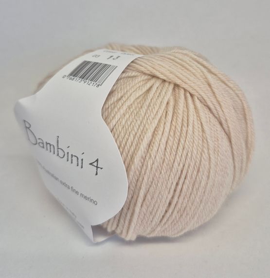 Bambini 4 from Prestige Yarns. Stunning quality without the high price tag. Australian extra fine merino and spun in Italy. 50 gr balls with 200 metres per ball. Machine wash. Needle rec. 2.75 to 3.25 mm.