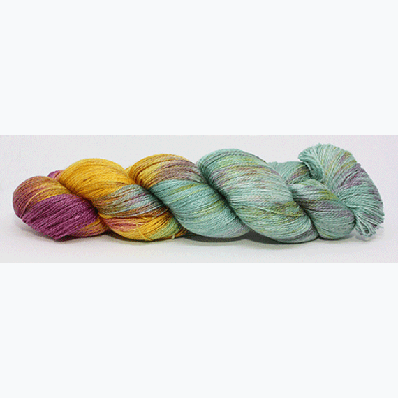 Fiori Lace (Hand dyed) is an exquisite lace weight, 2ply yarn. A lovely soft yarn with a touch of lustre from the silk