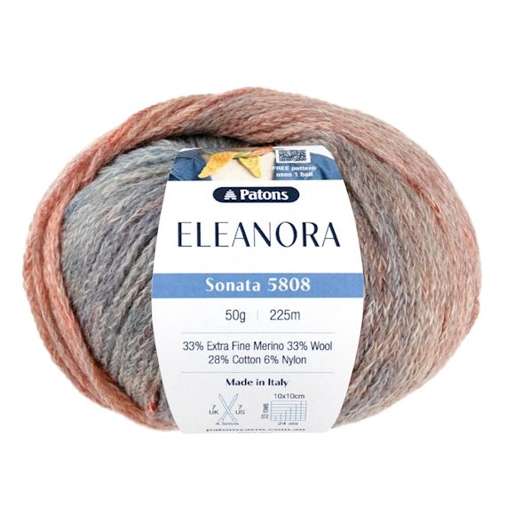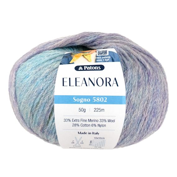 Arriving March 2026 - PRE ORDER NOW - Patons Eleanora is the most luxurious, lightweight colour changing blend. Made in Italy from 33% extra fine merino, 33% wool, 28% cotton and 6% nylon this super soft yarn is perfect for year-round knits. Enjoy the brightest colours for bold projects, or choose a subdued shade for gentle waves of changing colour.