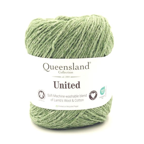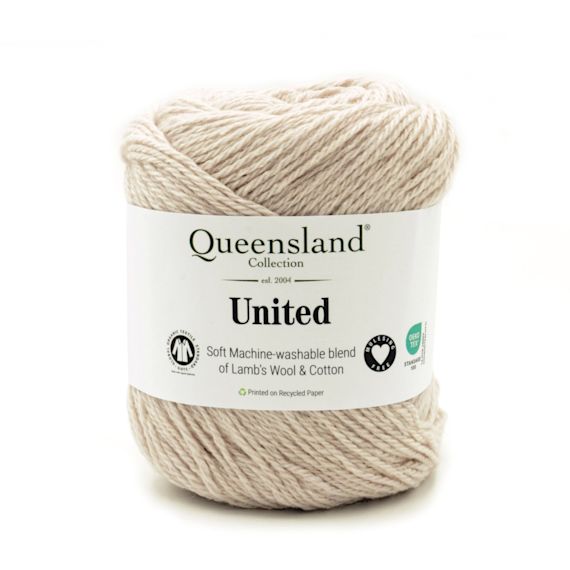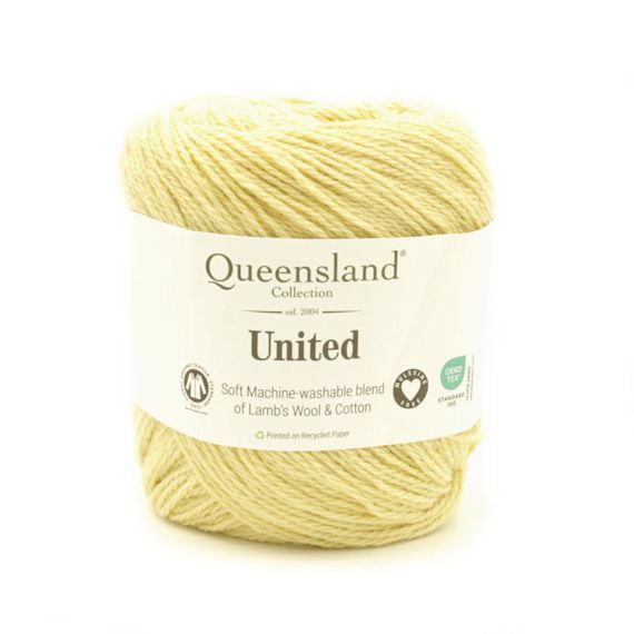 United by The Queensland Collection is a light and lovely lambswool and cotton blend. Approx a 5 ply - 55% lambswool and 45% cotton. 230 metres per ball. Mach washable. Needle rec. 3.25 to 3.75Mm. Crochet hook 3.5 to 4.5 mmm