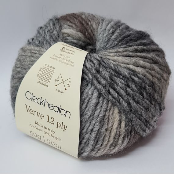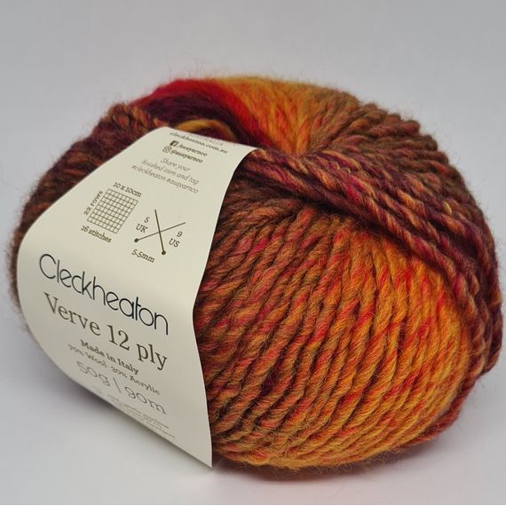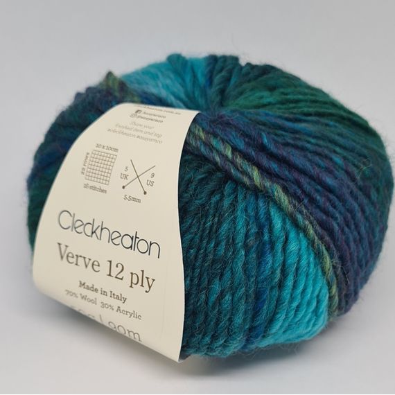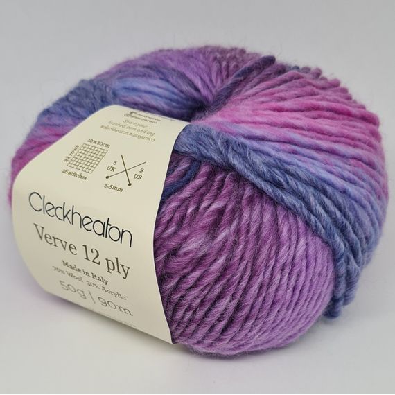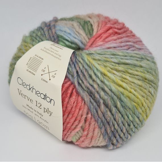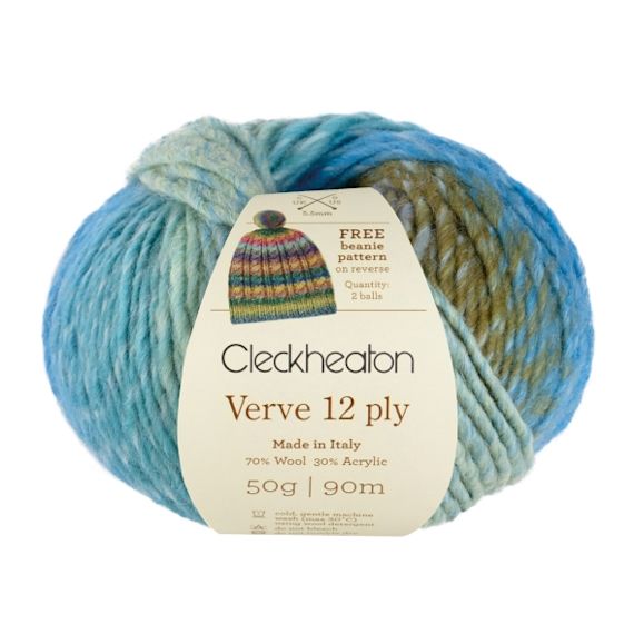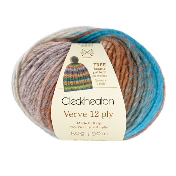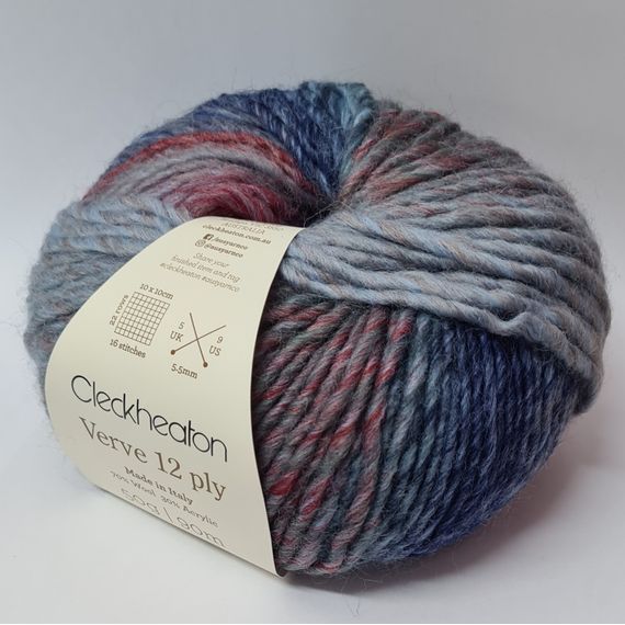 Cleckheaton - Verve 12 ply is a 70% wool 30% acrylic blend in beautiful colourways. 90 metres per 50 gr ball. Made in Italy. Gentle mach wash. 5.5 mm needles.